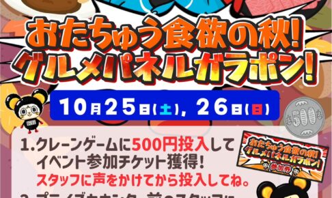 イベント📣イベント情報📣 10月25日、26日に【おたちゅう食欲の秋、グルメパネルガラポン】を開催します‼️ 詳しくは画像をご覧ください!ガラポンイベントは営業時間中ずっと開催しております!! みなさまのご参加お待ちしております…