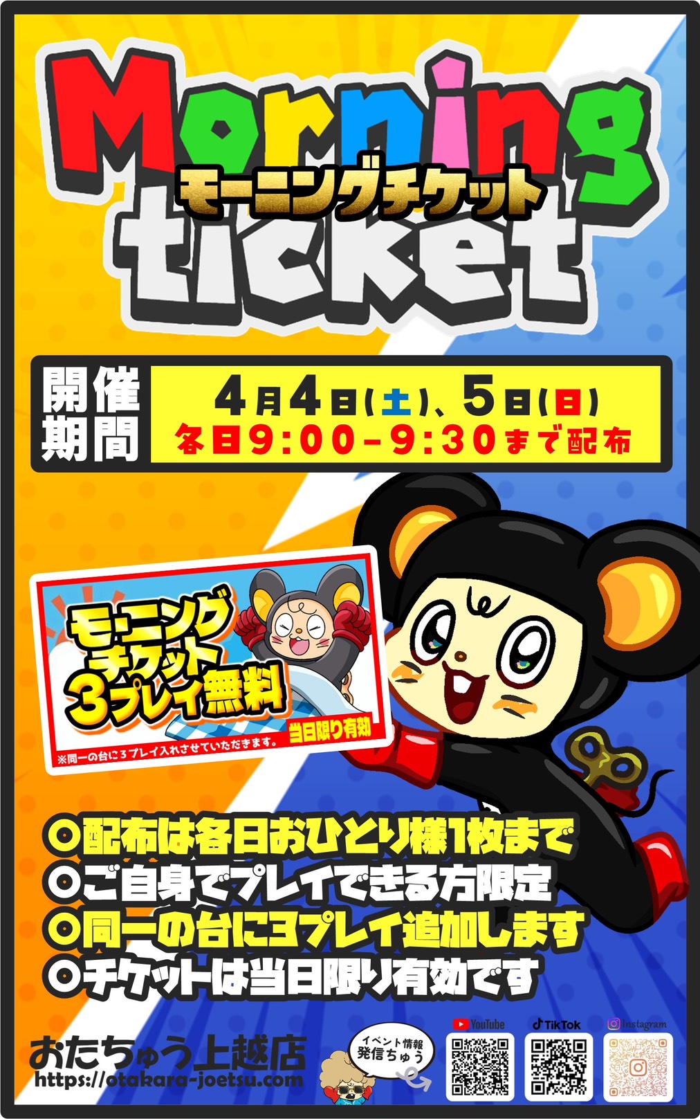 ■モーニングチケット■ 2026年3月27日 2026年4月2日 カレンダー カレンダーに追加 Timely カレンダーに追加 Google に追加 Outlook に追加 Apple カレンダーに追加 他のカレンダーに追加 XML ファイルとしてエクスポート 日時: 2026年4月4日 @ 9:00 AM – 9:30 AM Repeats 2026-04-04T09:00:00+09:00 2026-04-04T09:30:00+09:00