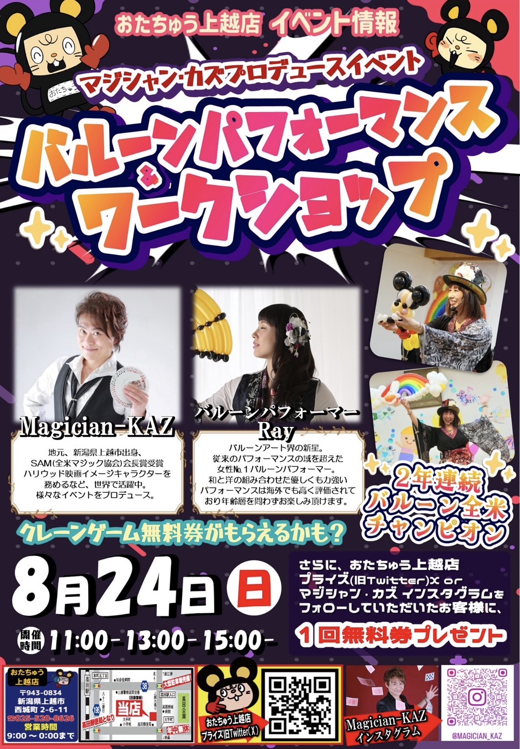 《8月24日》マジシャン·カズプロデュースイベント開催🎉 2025年8月24日 📣📣イベント情報📣📣 本日8月24日は‼️ おたちゅう上越店にてマジシャン·カズプロデュースイベントの開催日です🎉 🎈バルーン全米チャンピオンのRayさんが来てくれます🎈 開催時間は11:00-13:00-15:00です⚡️ 詳細は添付画像をご覧下さい。 ************************ こちら↓もぜひチェックしてみてくださいね♪(*´▽`*) ・最新のイベント情報はこちら ・最新の買取情報はこちら
