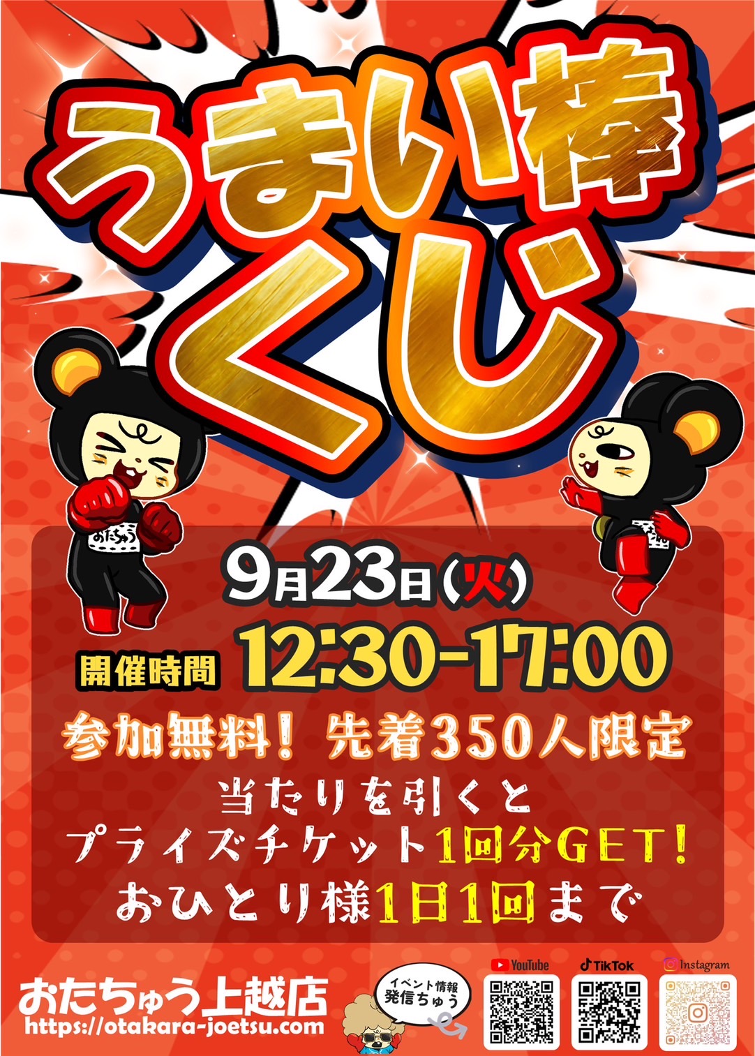 📣イベント情報📣9月23日 【うまい棒くじ】開催!! 2025年9月22日 📣イベント情報📣 お待たせいたしました‼️明日9月23日は【うまい棒くじ】を開催します‼️ 参加費無料!当たりが出なくてもうまい棒をGETできます! みなさまのご参加お待ちしております🌟🌟🌟 明日は夕方のイベントはお休みですのでご注意ください🙇 ************************ こちら↓もぜひチェックしてみてくださいね♪(*´▽`*) ・最新のイベント情報はこちら ・最新の買取情報はこちら