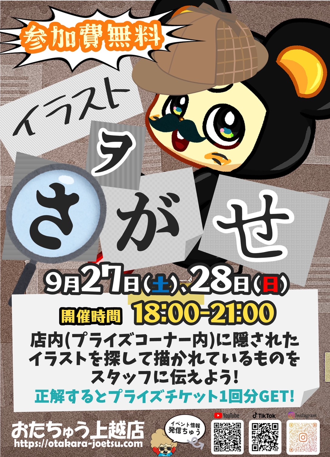 📣イベント情報📣 9月27日、28日の夕方イベントで【イラストを探せ】をします‼️ 2025年9月25日 📣イベント情報📣 9月27日、28日の夕方イベントで【イラストを探せ】をします‼️ 参加費無料!店内に貼られているイラストを探してください! みなさまのご参加お待ちしております💕 ************************ こちら↓もぜひチェックしてみてくださいね♪(*´▽`*) ・最新のイベント情報はこちら ・最新の買取情報はこちら