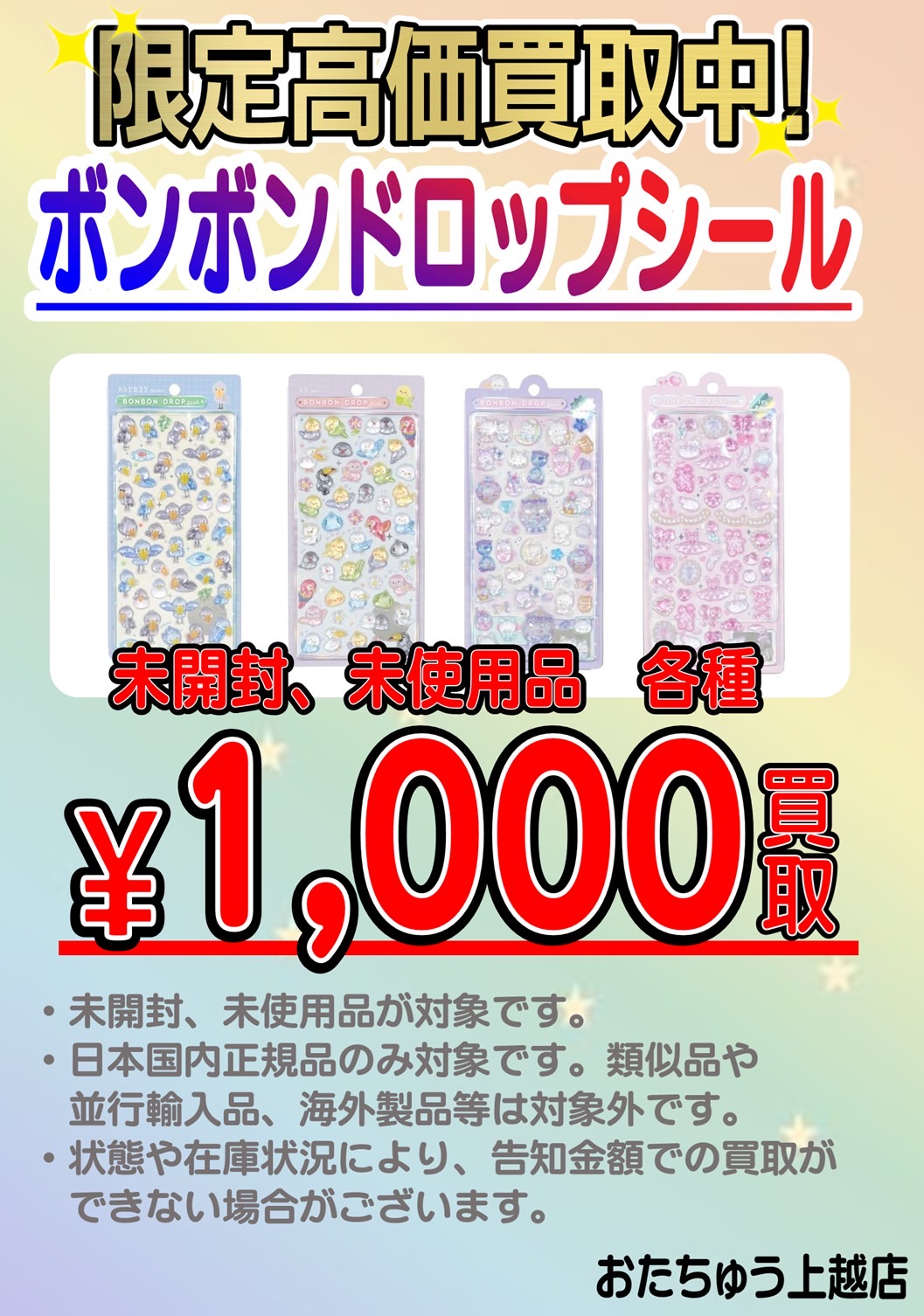 ◆ボンボンドロップシール 買取大募集中です!◆ 2025年12月3日 買取情報ですℹ️ 「ボンボンドロップシール」 未開封品1000円買取💰 ✨買取大募集中です✨ 使わないシール、ぜひお持ち込みください🙏 ※2025/12/3現在の価格となります。 在庫状況などによってお値段が変動いたします。予めご了承ください。 ************************ こちら↓もぜひチェックしてみてくださいね♪(*´▽`*) ・最新のイベント情報はこちら ・最新の買取情報はこちら