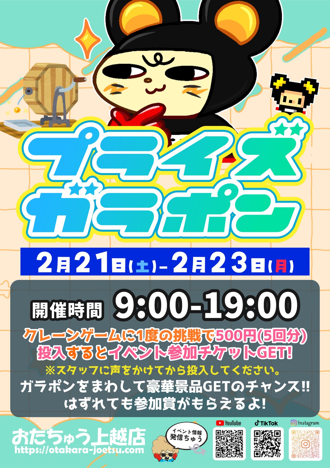 2/21~2/23★プライズガラポン 開催します! 2026年2月20日 📣イベント情報📣 2月21日から23日に【プライズガラポン】イベントを開催します‼️ 詳しくは画像をご覧ください!豪華景品を用意してお待ちしております⭐️ みなさまのご参加お待ちしております✨ ************************ こちら↓もぜひチェックしてみてくださいね♪(*´▽`*) ・最新のイベント情報はこちら ・最新の買取情報はこちら