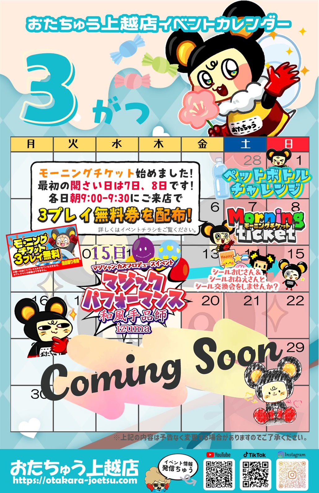 ⭐️3月のイベントカレンダーです⭐️ 2026年3月5日 2026年4月2日 📣イベントカレンダー更新📣 ⭐️お待たせいたしました‼️3月のイベントカレンダーです⭐️ 3月もイベントが盛りだくさん💖3月下旬のイベントにつきましては更新次第お知らせいたします📣 みなさまのご参加お待ちしております🌟 今月もおたちゅう上越店に遊びに来てね〜🎉 ************************ こちら↓もぜひチェックしてみてくださいね♪(*´▽`*) ・最新のイベント情報はこちら ・最新の買取情報はこちら